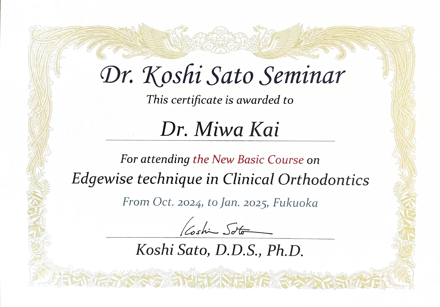 かい歯科 院内新聞 10月号 2025年10月28日 Dr. Koshi Sato Seminarベーシックコース/アドバンスコース修了 歯矯正の患者様のニーズの高まりと、自己研鑽の為に矯正の勉強会へ行ったまいりました。 これからも患者様方へより良い治療をお届けできるよう努力し続けたいです。 サティフィケイト
